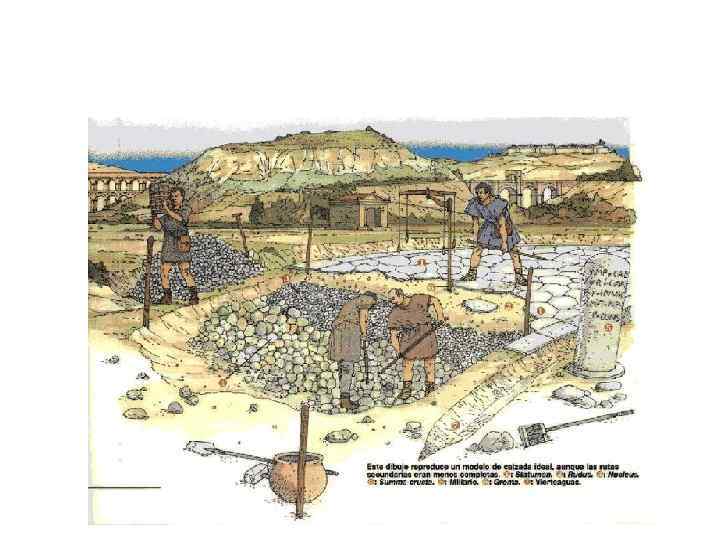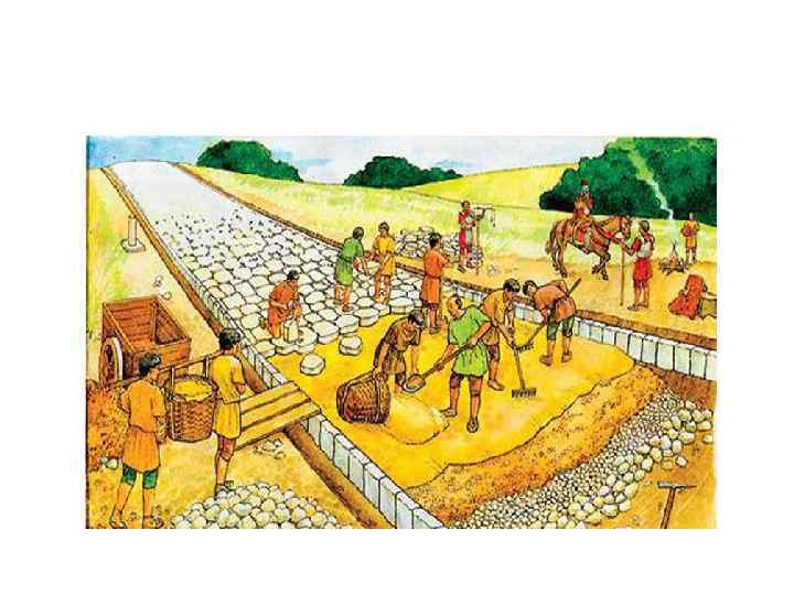 Строительство дорог в Римской империи • Наивысшего расцвета Римская империя достигла в 1 -2 вв. н. э. • Размеры Римской империи и проблемы управления ее явились причиной создания густой сети дорог. • Дорожную систему развивали исходя из военных потребностей. • Для каждой дороги предварительно составляли план, затем рыли траншею и заполняли камнями, для стока воды прорывали специальные водосточные канавы.