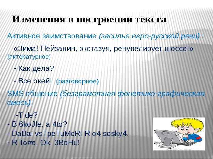 Построение текста в конце XX — начале XXI века ь еч р то ос пр жаргон е Русск ий язык Новейший русский язык Раз г эле оворн мен ы ты е Бюрократические, казённые элементы Иноязычные заимствования