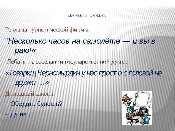 Жаргонизмы в поэтической речи По речке жизни плавал честный Грека И утонул, а может — рак настиг. При Греке заложили человека — И Грека заложил за воротник. В нём добрая заложена основа — Он оттого и начал поддавать, — "Закладывать" — обычнейшее слово, А в то же время значит — "предавать". Или ещё пример такого рода: Из-за происхождения взлетел, — Он вышел из глубинки, из народа, И возвращаться очень не хотел. Глотал упрёки и зевал от скуки, Что оторвался от народа — знал, — Но "оторвался" — это по науке, А по жаргону это — "убежал". В. Высоцкий