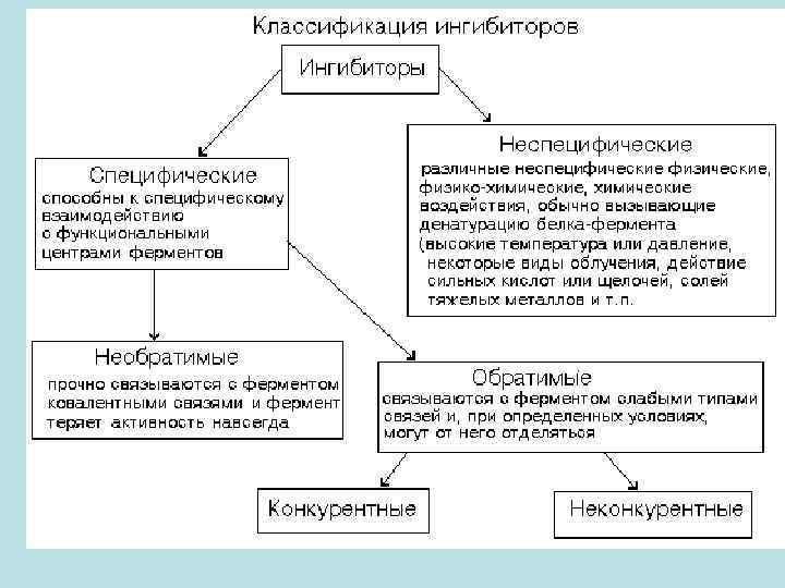 • Неконкурентное обратимое ингибирование не может быть ослаблено или устранено повышением концентрации субстрата, так как эти ингибиторы присоединяются к ферменту не в активном центре, а в другом месте.