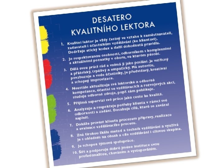 Role AIVD ČR v zajišťování kvality § § § Etický kodex AIVD ČR Desatero kvality vzdělávací instituce Desatero kvality lektora Soutěž Vzdělávací instituce roku Soutěž Lektor / Lektorka roku Expertní podíl na projektu KONCEPT