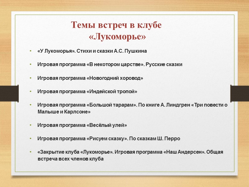 Темы встреч в клубе «Лукоморье» «У Лукоморья». Стихи и сказки А.С. Пушкина Игровая программа «В некотором царстве». Русские сказки Игровая программа «Новогодний хоровод» Игровая программа «Индейской тропой» Игровая программа «Большой тарарам». По книге А. Линдгрен «Три повести о Малыше и Карлсоне» Игровая программа «Весёлый улей» Игровая программа «Рисуем сказку». По сказкам Ш. Перро «Закрытие клуба «Лукоморье». Игровая программа «Наш Андерсен». Общая встреча всех членов клуба
