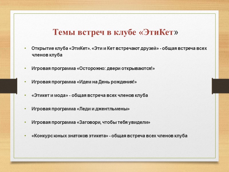Открытие клуба «ЭтиКет». «Эти и Кет встречают друзей» - общая встреча всех членов клуба Игровая программа «Осторожно: двери открываются!» Игровая программа «Идем на День рождения!» «Этикет и мода» - общая встреча всех членов клуба Игровая программа «Леди и джентльмены» Игровая программа «Заговори, чтобы тебя увидели» «Конкурс юных знатоков этикета» - общая встреча всех членов клуба Темы встреч в клубе «ЭтиКет»