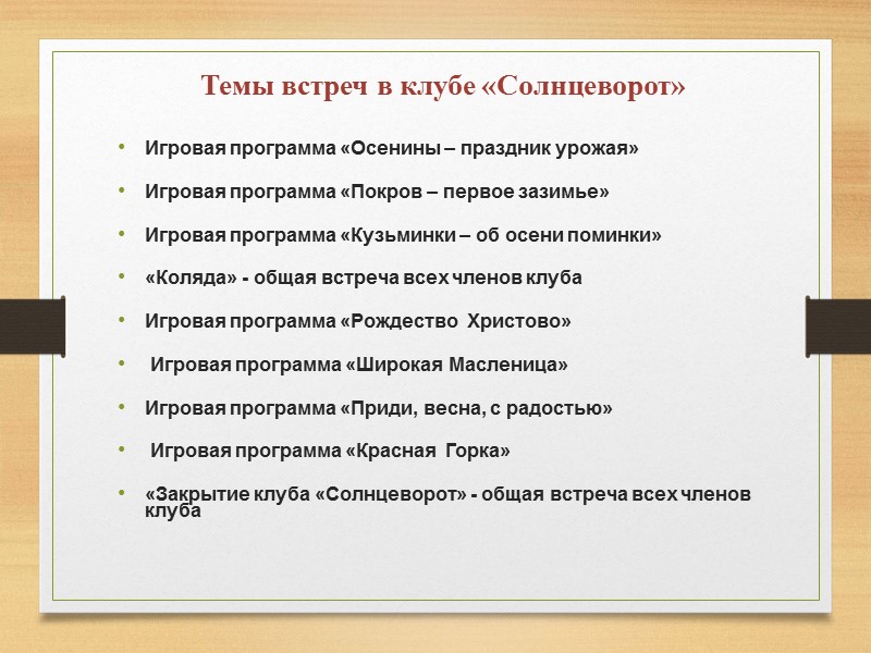 Темы встреч в клубе «Солнцеворот» Игровая программа «Осенины – праздник урожая» Игровая программа «Покров – первое зазимье» Игровая программа «Кузьминки – об осени поминки» «Коляда» - общая встреча всех членов клуба Игровая программа «Рождество Христово» Игровая программа «Широкая Масленица» Игровая программа «Приди, весна, с радостью» Игровая программа «Красная Горка» «Закрытие клуба «Солнцеворот» - общая встреча всех членов клуба
