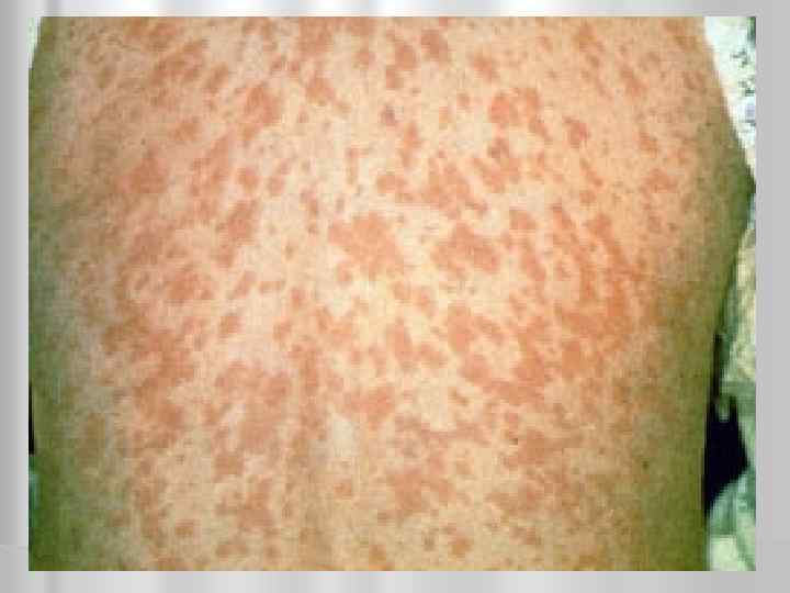 экзантема В течение нескольких часов беспорядочно распространяется по всему телу (спина, ягодицы, разгибательные поверхности рук и ног). На ладонях и подошвах сыпи нет. l Элементы сыпи- это пятна бледно-розового цвета, круглые с ровными краями, без тенденции к слиянию. l Располагается на неизмененной коже l l Исчезает бесследно через 1 -3 дня