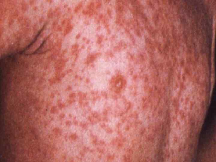 клиника На 4 -й день состояние улучшается, температура снижается l 5 -й день - начинается период высыпаний, появляется обильная экзантема: -пятнисто-папулезный характер -тенденция к слиянию -неровные края -свободная от сыпи кожа нормальной окраски l