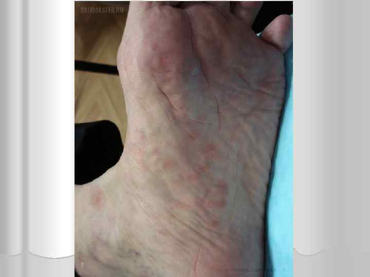 клиника -Скарлатиноподобная сыпь, локализуется симметрично на боковых поверхностях туловища, в аксиллярных областях, на нижних и верхних конечностях. -Выявляется белый дермографизм