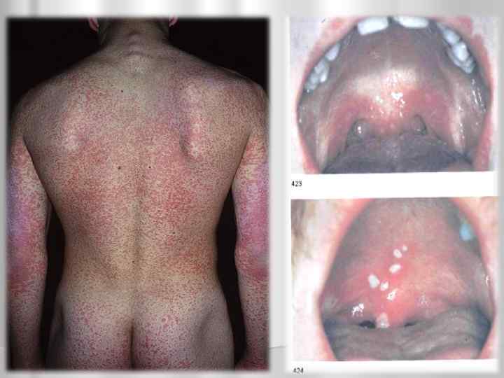экзантема 2 -3 -я неделя отрубивидное шелушение кожи на туловище, лице и грубое пластинчатоена ладонях и стопах