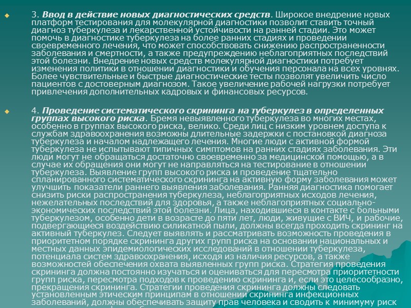 3. Ввод в действие новых диагностических средств. Широкое внедрение новых платформ тестирования для молекулярной диагностики позволит ставить точный диагноз туберкулеза и лекарственной устойчивости на ранней стадии. Это может помочь в диагностике туберкулеза на более ранних стадиях и проведении своевременного лечения, что может способствовать снижению распространенности заболевания и смертности, а также предупреждению неблагоприятных последствий этой болезни. Внедрение новых средств молекулярной диагностики потребует изменения политики в отношении диагностики и обучения персонала на всех уровнях. Более чувствительные и быстрые диагностические тесты позволят увеличить число пациентов с достоверным диагнозом. Такое увеличение рабочей нагрузки потребует привлечения дополнительных кадровых и финансовых ресурсов. 4. Проведение систематического скрининга на туберкулез в определенных группах высокого риска. Бремя невыявленного туберкулеза во многих местах, особенно в группах высокого риска, велико. Среди лиц с низким уровнем доступа к службам здравоохранения возможны длительные задержки с постановкой диагноза туберкулеза и началом надлежащего лечения. Многие люди с активной формой туберкулеза не испытывают типичных симптомов на ранних стадиях заболевания. Эти люди могут не обращаться достаточно своевременно за медицинской помощью, а в случае их обращения они могут не направляться на тестирование в отношении туберкулеза. Выявление групп высокого риска и проведение тщательно спланированного систематического скрининга на активную форму заболевания может улучшить показатели раннего выявления заболевания. Ранняя диагностика помогает снизить риски распространения туберкулеза, неблагоприятных исходов лечения, нежелательных последствий для здоровья, а также неблагоприятных социально-экономических последствий этой болезни. Лица, находившиеся в контакте с больными туберкулезом, особенно дети в возрасте до пяти лет, люди, живущие с ВИЧ, и рабочие, подвергающиеся воздействию силикатной пыли, должны всегда проходить скрининг на активный туберкулез. Следует выявлять и рассматривать возможность проведения в приоритетном порядке скрининга других групп риска на основании национальных и местных данных эпидемиологических исследований в отношении туберкулеза, потенциала систем здравоохранения, исходя из наличия ресурсов, а также возможностей обеспечения охвата выявленных групп риска. Стратегия проведения скрининга должна постоянно изучаться и оцениваться для пересмотра приоритетности групп риска, пересмотра подходов к проведению скрининга и, если это целесообразно, прекращения скрининга. Стратегии проведения скрининга должны следовать установленным этическим принципам в отношении скрининга инфекционных заболеваний, должны обеспечивать защиту прав человека и сводить к минимуму риск ощущения дискомфорта, боли, стигматизации и дискриминации.