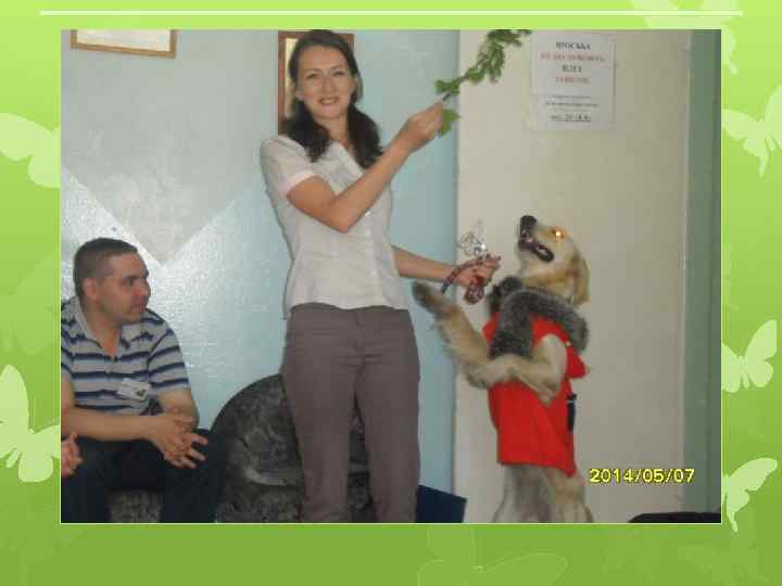 6. Для работы с вышеперечисленными категориями пациентов по определенным правилам отбираются и подбираются собаки, которые проходят первичное тестирование, обучение и окончательное (сертификационное) тестирование. • • Первичное тестирование определяет уровень контроля основных видов агрессии псовых: пищевой, иерархической, охотничьей, игровой, покровительственной. Также, тест определяет уровень тревожности собаки к незнакомым предметам и людям, громким звукам, странному поведению. Первичный тест НЕ ОЗНАЧАЕТ, что собака готова работать терапевтом. Тест определяет, может ли она быть выучена на терапевта.