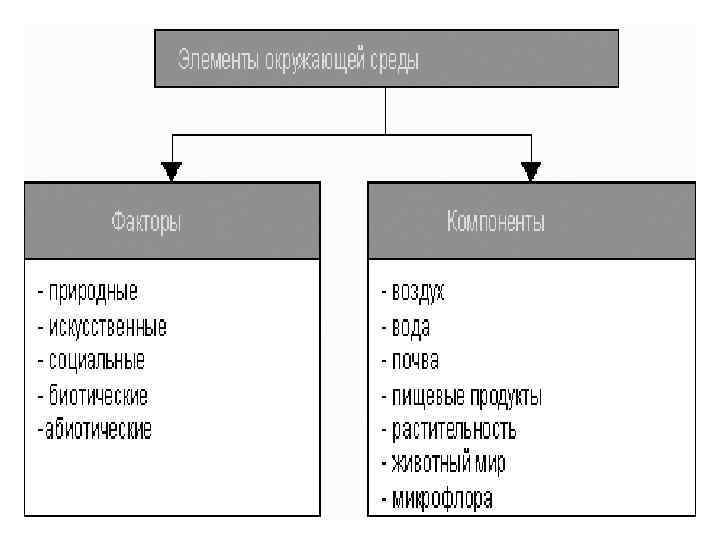 Факторы окружающей среды, влияющие на здоровье человека: • Природные элементы среды (воздух, вода, почва, радиация, пища) • Социальные элементы среды (труд, быт, соц. -экономический уклад, информация)