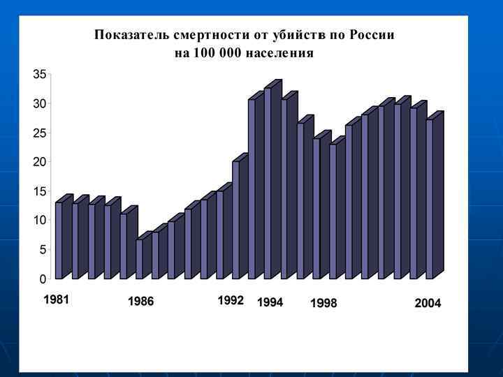 n n В 2004 году в России зафиксировано 39 256 смертей. Этот показатель, характеризующий «уровень безопасности жизни в государстве» оказался выше, чем в 1986 г. почти в 4 раза.