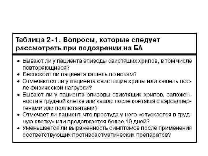 Особенности респираторных симптомов при БА (2014) • Наличие более, чем одного симптома (свисты, одышка, кашель, чувство заложенности в груди) • Часто симптомы ухудшаются ночью или утром • Симптомы вариабельны по времени и интенсивности • Симптомы провоцируются вирусными инфекциями (простудой), физической нагрузкой, воздействием аллергена, изменениями погоды, смехом, раздражающими веществами (дым, резкие запахи, выхлопные газы автомобиля)