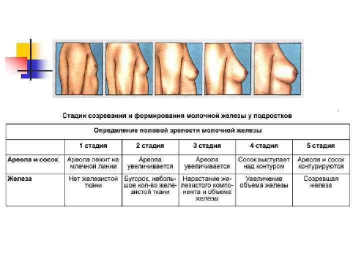Созревание молочных желез • Вплоть до пубертатного периода молочные железы у мальчиков и девочек одинаковы • Развитие молочной железы является первым признаком начала полового созревания у девочек – Приблизительно за 6 мес. до менархе наблюдается активизация роста МЖ. – Увеличение МЖ начинается обычно в 11– 12 лет, но может произойти раньше или позже (от 9 до 13– 14 лет), что тоже считается нормальным. – Возрастное созревание МЖ проходит 5 стадий. – Процесс созревания молочной железы занимает в среднем до 4 х лет, хотя разброс довольно большой от 6 мес. до 8 лет. • О завершении созревания молочной железы можно говорить после появления последних признаков полового созревания • Конечной же стадией этапа развития молочной железы является грудь во время беременности и лактации
