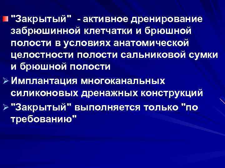 "Закрытый" активное дренирование забрюшинной клетчатки и брюшной полости в условиях анатомической целостности полости сальниковой сумки и брюшной полости Ø Имплантация многоканальных силиконовых дренажных конструкций Ø "Закрытый" выполняется только "по требованию"