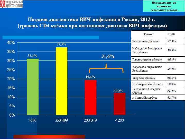 • На 01. 15 общее число зарегистрированных случаев ВИЧ/СПИДа в России достигло 900 000 случаев. • Не входят случаи зарегистрированные в Крыму и Севастополе (от 20 000 до 30 000 случаев). • Ежедневно в России регистрируются 200 новых случаев ВИЧ-инфекции. • Число случаев смерти превысило 175 000 ю • В 2013 г умерло от всех форм туберкулёза 16 190 (51%). • Умерло от болезней, вызванных ВИЧ, 10 611 (33%)