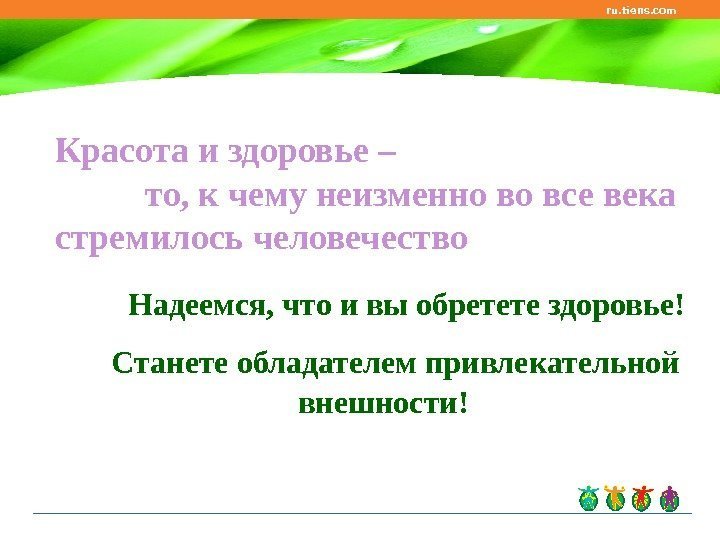 ru. tiens. com Красота и здоровье – то, к чему неизменно во все века стремилось человечество Надеемся, что и вы обретете здоровье! Станете обладателем привлекательной внешности!