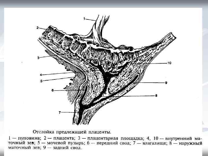 n Предлежание плаценты – аномалия расположения плаценты, при которой она прикрепляется в области нижнего маточного зева, часть ее находится в области внутреннего маточного зева, частично или полностью перекрывая его (в N она прикрепляется в области тела матки и своим нижним краем не доходит до внутреннего зева на 7 -8 см и более).