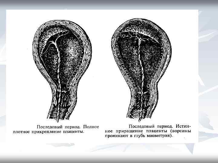 n Отдифферинцировать формы патологического прикрепления плаценты возможно только при ручном обследовании полости матки – при плотном прикреплении плацента отделяется, при истинном вращении нет