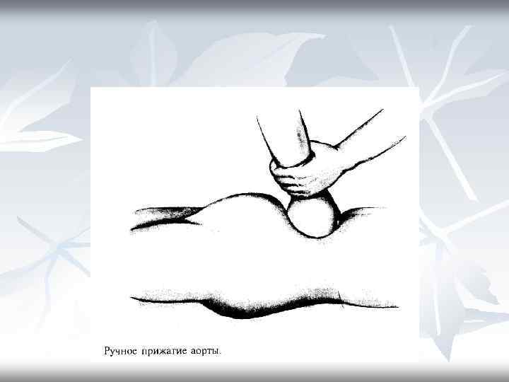 n n Повторные ручные обследования полости матки, введения утеротонических средств будут неэффективными. В процессе подготовки к операции используют ряд мероприятий, препятствующих притоку крови к матке и вызывают ее ишемию – прижатие брюшной аорты к позвоночнику через переднюю брюшную стенку