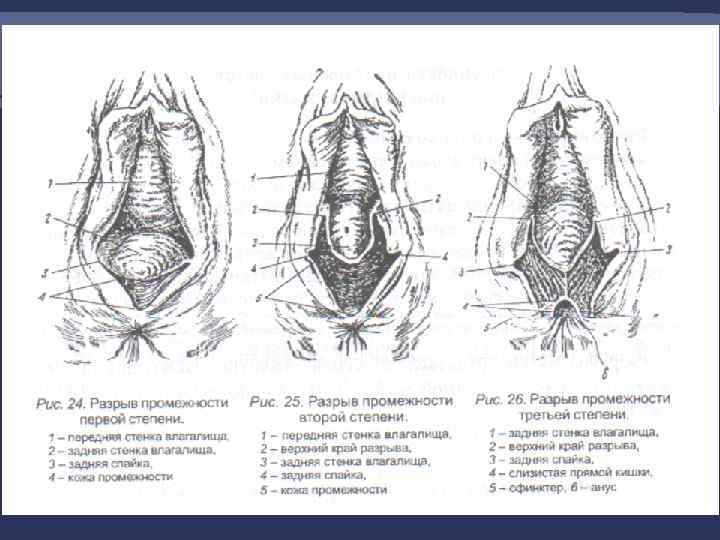 Классификация 1. По глубине повреждения: - I степени – нарушение целостности кожи и подкожной клетчатки задней спайки; - II степени – нарушены кожа промежности, подкожная жировая клетчатка, мышцы тазового дна, в том числе m. levator ani, задняя или боковые стенки влагалища; - III степени – кроме вышеперечисленных образований происходит разрыв наружного сфинктера прямой кишки, а иногда и передней стенки прямой кишки;