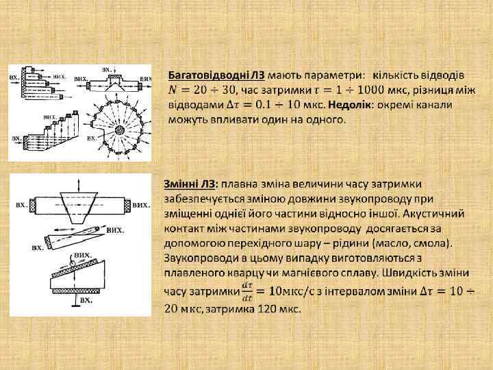Дисперсійні ЛЗ Перпендикулярно-дифракційні ЛЗ (А) - вхідний та вихідний перетворювачі виконано у вигляді однофазних нееквідистантних граток (з смужок п’єзоелектрика Cd. S, Zn. O) та нанесено на взаємно перпендикулярні грані кварцу.