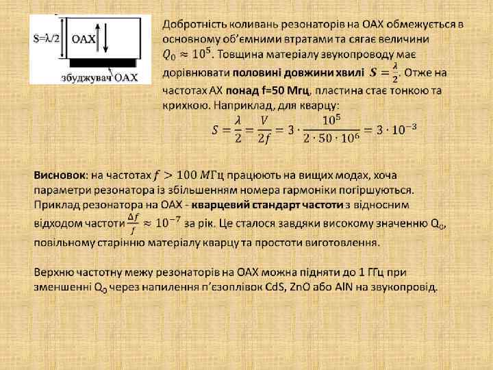 4. 8. 3. Добротність АХ резонаторів Чинники величини добротності резонаторів на ПАХ: 1) в’язкістні втрати в матеріалі звукопроводу; 2) втрати, пов’язані з передачею енергії хвилям, що збуджуються в повітрі; 3) втрати, пов’язані з дифракційною розбіжністю пучку хвиль; 4) втрати, пов’язані із генерацією об’ємних АХ перетворювачами; 5) випромінення, пов’язане із витіканням енергії хвиль через відбиваючі гратки. Якщо позбутися вкладів п. 3 -5 та розмістили прилад у вакуумі, то добротність резонатора буде обмежуватись тільки в’язкими втратами. - відповідні розрахунки для кварцу та ніобата літію в повітрі та вакуумі.