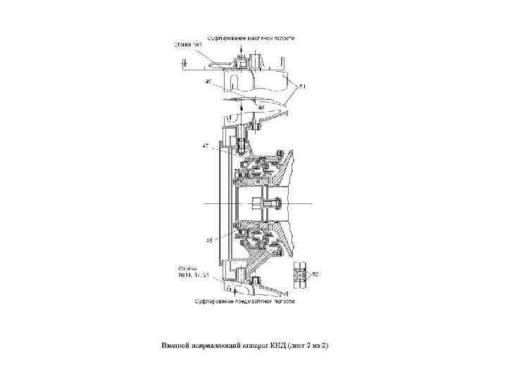 КНД из ротора 2 и статора 3. В состав статора входят: • корпус под форсунки 23, стальной, имеет бобышки (23 шт. ) под форсунки системы промывки проточной части; • входной направляющий аппарат 1; • кок 21, состоящий из двух обечаек, образующих полость, через которую поступает горячий воздух из за седьмой ступени КВД; • передняя опора 19 КНД; • корпус проставка 5 стальной, с горизонтальным разъемом; • корпус 6 первой, второй, третьей ступеней НА КНД, стальной с горизонтальным разъемом, с пазами Т образной формы для крепления лопаток НА КНД; • направляющие аппараты первой, второй, третьей ступеней, состоящие из паянных секций направляющих лопаток 7, 8, 9 и внутренних полуколец 1, 2, 3. На корпусах статора над рабочими лопатками ротора, а также на внутренних полукольцах направляющих аппаратов нанесена спецсмесь. Входной направляющий аппарат 1 является силовым элементом газогенератора. В состав ВНА входят: • наружное кольцо 35; • ступица 34; • стойки 1. . . 23. Наружное кольцо 35 с обечайкой коллектора 36 образуют полость, в которую через отверстия в бобышках 24 подается горячий воздух из за VII ступени КВД к стойкам и коку (система ПОС). Стойки 1… 23 с закрылками 51 образуют единый аэродинамический профиль. Через семь стоек проходят трубопроводы: • в стойке 1 суфлирования масляной полости; • в стойке 5 подвода масла; • в стойке 8 откачки масла; • в стойках 14, 17, 21 суфлирования предмасляной полости; • в стойке 11 слива масла. В ВНА смонтированы: • передняя опора КНД 19 ; • откачивающий маслонасос 20; • кок 21. Передняя опора закреплена на заднем фланце ступицы ВНА и состоит из корпуса 28 роликоподшипника, лабиринтного уплотнения 45, крышек 43 и 44 лабиринтного уплотнения. Корпус роликоподшипника 28 составляют наружный и внутренний корпуса. Упруго подвижная передняя часть корпуса связана с неподвижным фланцем ступицы упругими перемычками «А» . Перетекания масла через жиклеры упругого кольца 47 в полостях между корпусами гасят радиальные колебания ротора. Система лабиринтных уплотнений предотвращает попадание масла в проточную часть при работе газогенератора. Корпуса статора имеют окна 11 осмотра лопаток КНД. Окна закрыты резьбовыми пробками 10. Ротор барабанно дисковой конструкции, опирается передней цапфой 1 на роликовый, а задней цапфой 13 на шариковый подшипники. В барабане ротора за диском первой ступени имеются отверстия «А» для подвода воздуха из проточной части компрессора во внутреннюю полость ротора для разгрузки осевых сил, действующих на ротор компрессора. Рабочие лопатки в дисках установлены в замках «ласточкин хвост» . В диск первой ступени установлены тридцать семь рабочих лопаток, в диск второй ступени сорок пять, в диск третьей ступени пятьдесят семь и в диск четвертой ступени сорок три рабочих лопатки. Болты 14 служат для осевой фиксации в замках рабочих лопаток первой ступени. Осевая фиксация лопаток второй, третьей и четвертой ступеней производится стопорными кольцами 16. Болты 14 одновременно являются балансиро вочными грузиками. От ротора осуществляется привод откачивающего маслонасоса передней опоры.
