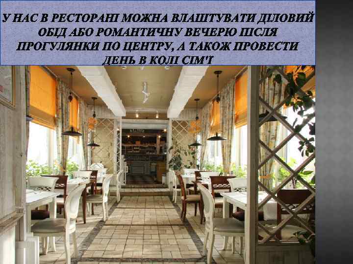 Пропозиції: Банкети, Безкоштовний Wi-Fi, Бізнес ланч, Дні народження, Їжа на винос, Сніданок, Карта вин, Корпоративи Приємності: Бенкетний зал, Літня веранда, Столики для некурців.