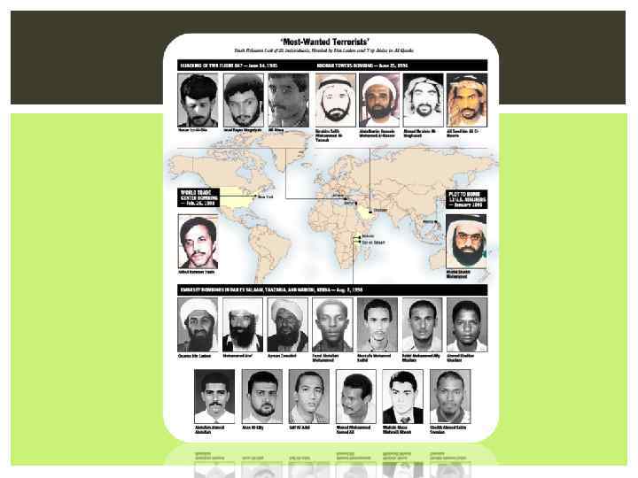 ЯЧЕЙКИ И СОЮЗНЫЕ ОРГАНИЗАЦИИ: § § § § § Аль-Каида в странах исламского Магриба Аль-Каида в Ираке Аль-Каида на Аравийском полуострове • Египетский исламский джихад Джамаат Аш-Шабааб Ливийская исламская боевая группа Туркестанское исламское движение Талибан Хаккани Джемаа Исламия