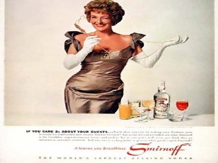 …the results: • “Before 1975 or 1980, there was a substantial increase in the consumption of alcohol throughout the industrialized countries. ” – wealth ad target. • “Before 1980, the increase in alcohol consumption primarily involved men and, today, excess male mortality is higher than it was forty years ago” –masculinity in ads.