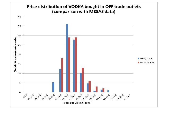 Scottish general population: Trend towards less sales at below 50 ppu In 2008, 81% of all off-trade alcohol was sold at less than 50 ppu, falling to 66% in 2011. • At the upper end of the price distribution, 95% of all off-trade alcohol was sold at less than 70 ppu in 2008, falling to 91% in 2011. • For instance, there was a 22% point decrease between 2008 and 2011 in the proportion of alcohol sold at less than 40 ppu, compared with only a 4% point drop in the proportion sold at below 70 ppu. But the proportion that patients are buying at that level has INCREASED not decreased. . . because those purchases can still be made. There are fewer products at 9 p/unit, but still 14 p/unit
