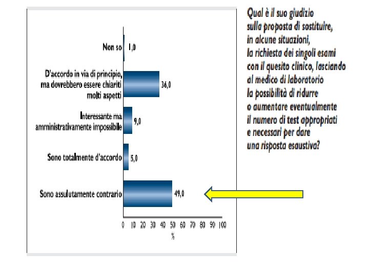 LE STRATEGIE PER MIGLIORARE L’APPROPRIATEZZA DELLA RICHIESTA ü Educazione all’appropriata indicazione e al ragionamento probabilistico ü Monitoraggio della richiesta da parte del Laboratorio mediante un ritorno al richiedente dei volumi dei test richiesti con i costi correlati ü Adattamento di Linee Guida internazionali EBM alla realtà locale ü Costruzione di rapporti di comunicazione costanti con i medici prescrittori (iniziative di informazione e formazione) ü Sistemi di reporting di efficacia ai richiedenti, con indicazione del tasso di positività ü Uso di profili interni di richiesta a cascata