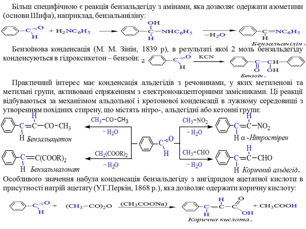 Більш специфічною є реакція бензальдегіду з амінами, яка дозволяє одержати азометини (основи Шифа), наприклад, бензальаніліну: Бензоїнова конденсація (M. M. Зінін, 1839 р), в результаті якої 2 моль бензальдегіду конденсуються в гідроксикетон – бензоїн: Практичний інтерес має конденсація альдегідів з речовинами, у яких метиленові та метильні групи, активовані спряженням з електроноакцепторними замісниками. Ці реакції відбуваються за механізмом альдольної і кротонової конденсації в лужному середовищі з утворенням похідних стирену, що містять нітро-, альдегідні або кетонні групи: Особливого значення набула конденсація бензальдегіду з ангідридом ацетатної кислоти в присутності натрій ацетату (У.Г.Перкін, 1868 р.), яка дозволяє одержати коричну кислоту: