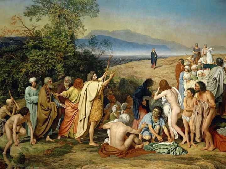 • • • Тема картины взята из первой главы Евангелия от Иоанна. Сам Иванов называл этот сюжет «всемирным» , поскольку художник показывает человечество в переломный, решающий момент его истории. Участники картины объединены в группы. В центре композиции – Иоанн Креститель, совершающий обряд крещения в водах реки Иордан. Он указывает собравшимся на приближающегося Христа. В левой части картины, за Иоанном Крестителем изображена группа апостолов: юный Иоанн Богослов, за ним – Петр, далее – Андрей Первозванный и Нафанаил. Этой группе противостоит толпа нисходящих с холма во главе с фарисеями. Среди них выделяется фигура человека в коричневом хитоне с непокрытой головой. В нем угадываются портретные черты писателя Н. В. Гоголя, с которым был дружен Иванов. Пространство картины оказывается, таким образом, как бы пронизанным действиями сил, влекущих к Христу и уводящих от него. Обозревая первый план картины, мы встречаем лица, отмеченные мучительной работой сознания. Композиционно картина построена так, что люди на первом плане будто глядятся в гигантское зеркало, в котором отразилась природа с выступающей на ее фоне фигурой Христа. Он словно приносит с собой завет спокойствия и умиротворяющей гармонии, которые властвуют в природном мире. Затянувшаяся на многие годы работа над картиной была связана с взыскательным поиском того, что можно было бы назвать конкретным наполнением символистического каркаса композиции. Полем экспериментального поиска стали этюды. В них многократно варьируются образы картины – раба, дрожащего, сомневающегося и других. В картине Иванов изобразил человеческие характеры, темпераменты, состояния во всем их бесконечном многообразии: здесь и уже обращенные в христианскую веру, и язычники, колеблющиеся, испуганные, сомневающиеся. На первом плане выделяется группа «раба и господина» . Особенно характерно лицо раба, о котором Иванов сказал: «Сквозь привычное страдание впервые появилась отрада» . В глубине центральной группы – человек в серой широкополой шляпе с посохом. Это так называемый «странник» , в образе которого Иванов запечатлел самого себя.