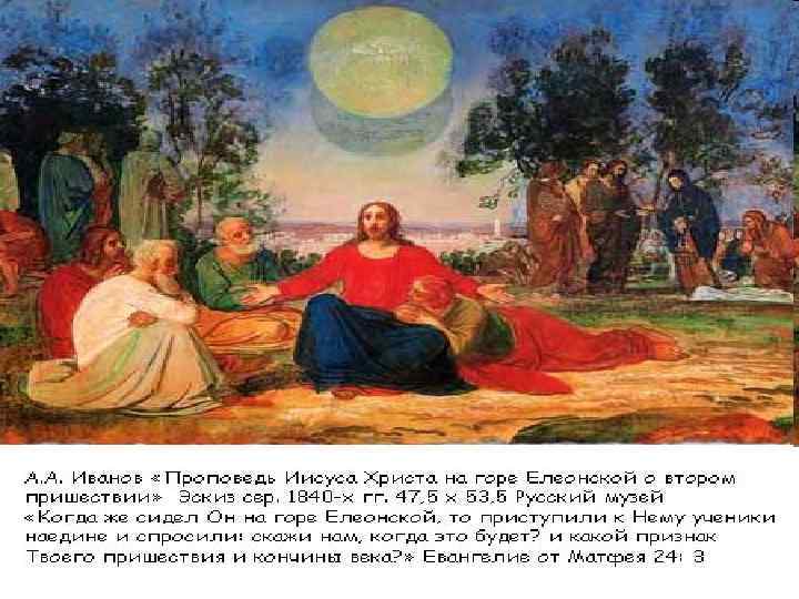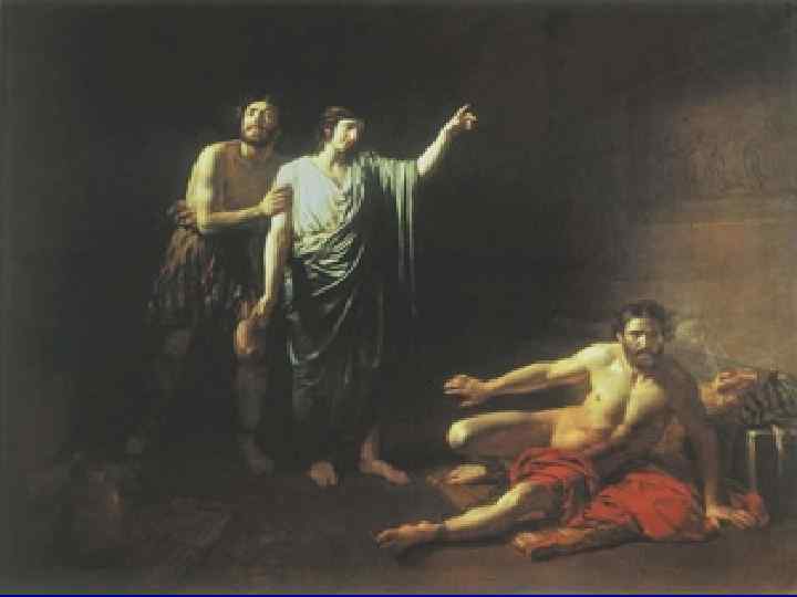 Краткая биография. • • • Сын А. И. Иванова. В 1831 -58 жил в Италии. В ранних произведениях ( «Аполлон, Гиацинт и Кипарис» , 1831 -34) дал возвышенно-поэтическое истолкование принципов классицизма. В дальнейшем стал крупнейшим представителем романтизма. Углубленно работал над натурой, добился значительных успехов в области пленэрной живописи. Философские проблемы, романтические религиозно-нравственные утопии духовного возрождения человечества составляют основное содержание монументального полотна «Явление Христа народу» (1837 -57, многочисленные этюды). В поздних произведениях ( «Библейские эскизы» ) Иванов, сохраняя связь с традициями классического монументализма, достигает необычайной глубины философского обобщения и истолкования темы Крупнейший мастер русского изобразительного искусства романтизма, живописец-философ, запечатлевший в своем творчестве итог нравственных и эстетических исканий своего времени. Родился в семье видного живописца-классициста А. И. Иванова. Отец был главным наставником будущего мастера во время его учебы в Академии художеств (1817 -28). Ранние полотна Иванова — «Приам, испрашивающий у Ахиллеса тело Гектора» (1824, Третьяковская галерея) и «Иосиф, толкующий сны заключенным с ним в темнице хлебодару и виночерпию» (1827, Русский музей) — показали, что он блестяще усвоил принципы академического классицизма.