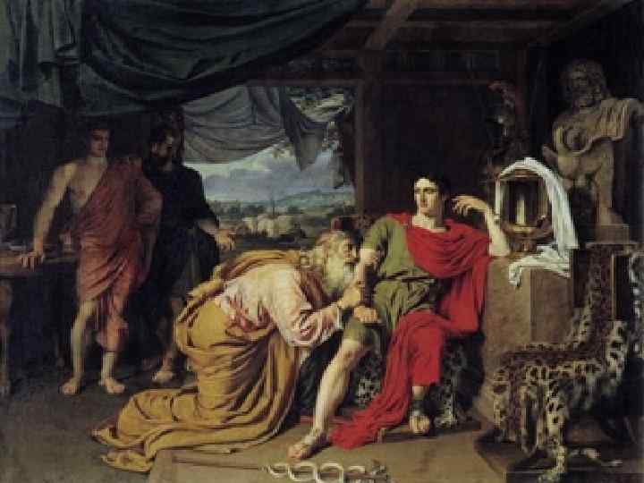 Первая картина. • • Это первая большая картина, выполненная художником в восемнадцать лет. Это раннее произведение получило высокую оценку и у публики, и у руководства Академии художеств, благосклонно отозвавшегося о картине. Общество поощрения художников удостоило автора малой золотой медали. Тему картины определила Академия художеств. Иванову было предложено написать сцену на сюжет последней, двадцать четвертой песни «Илиады» Гомера. Приам – царь осажденной Трои, проникает в палатку предводителя враждебного лагеря Ахилла, чтобы вымолить у него для погребения тело своего сына Гектора, сраженного Ахиллом у стен Трои. Из поэмы известно, что Ахилл проявит великодушие и исполнит просьбу Приама. Однако художник избирает момент, когда решение еще не принято. Ахилл, изображенный около погребальной урны с прахом его друга Патрокла, сраженного Гектором, погружен в глубокую скорбь. Прикосновение руки Приама с трудом возвращает его к действительности. Он будто бы только очнулся от тяжелого сна и не осознает, что происходит вокруг; он еще не знает своего решения. Контур кисти опущенной руки Ахилла повторяет абрис белой драпировки, покрывающей урну с прахом убитого друга. Уже в ранней своей работе художник расширяет возможности академической картины, стремясь показать античную драму в динамике, когда решение не принято и развязки трагедии еще не предвидится.