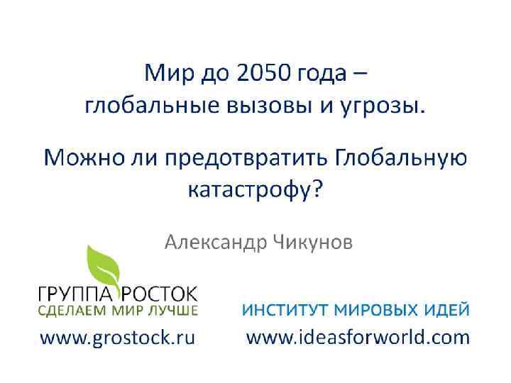 • Александр Чикунов • основатель и руководитель Группы Росток, член The Balaton Group • После завершения реорганизации ОАО «РАО «ЕЭС России» занимается поиском и реализацией «прорывных» инновационных проектов, направленных на улучшение жизни человека. • В 2009 году основал «ГРУППУ РОСТОК» , которая ориентирована на разработку проектов, результаты которых смогут улучшить будущее человека и будут важны и значимы для общества в целом. • В 2011 году основал Институт Мировых Идей. • Доклад в РОСНАНО в 2011 г. 2
