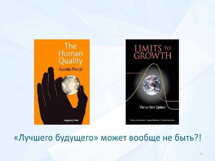 «Я убежден, что мир уже вышел за пределы по многим направлениям. В 1972 году было еще не поздно менять траекторию. Теперь – поздно, и мы неизбежно получим “жесткую” посадку» . Деннис Медоуз, 2011. «Глобальная катастрофа – это не конкретный день или год. Это процесс. И мы уже в нем» . Дэвид Берри, 2011. 1. Мы столкнулись с Системным кризисом – нет «главного звена» для воздействия, надо двигаться по всем направлениям. 2. Научно-технические инновации отдельно не спасут ситуацию. 3. Гигантские запаздывания в процессе принятия и реализации решений. 126