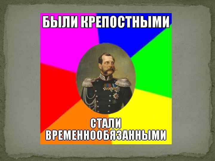 Основные положения крестьянской реформы Крестьяне перестали «временнообязанными» . считаться крепостными и стали считаться Помещики сохраняли собственность на все принадлежавшие им земли, однако обязаны были предоставить в пользование крестьянам «усадеб оседлость» и полевой надел. За пользование надельной землёй крестьяне должны были отбывать барщину или платить оброк и не имели права отказа от неё в течение 9 лет. Размеры полевого надела и повинностей должны были фиксироваться в уставных грамотах 1861, которые составлялись помещиками на каждое имение и проверялись мировыми посредниками. Крестьянам предоставлялось право выкупа усадьбы и по соглашению с помещиком — полевого надела, до осуществления этого они именовались временнообязанными крестьянами, те кто воспользовался этим правом, после осуществления полного выкупа назывались «выкупными» крестьянами (до конца царствования Александра II в эту категорию попали 85 % бывших крепостных) Также определялась структура, права и обязанности органов крестьянского общественного управления (сельского и волостного) суда.