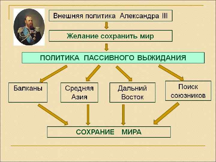Александр III 1881 -1894 Александр III. Второй сын Александра II. после смерти старшего брата стал наследником престола. Образование цесаревича носило военный характер, но историю ему преподавал С. М Соловьев. В 1866 г. Александр женился на датской принцессе Дагмаре (Марии Федоровне). Царь был трудолюбив, старался вникнуть во все дела сам, но императору не хватало гибкости ума.