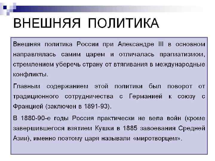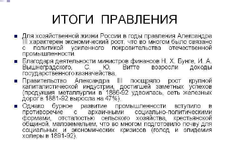 Крестьянский вопрос • 28. 12. 81 - отменен закон об обязательном выкупе наделов и временнообязанное состояние; • снижен размер выкупных платежей. • снижена подушная подать; • создан Крестьянский банк; • 1893 г. – закон об ограничении выхода крестьян из общины, запрет на продажу общинной земли.