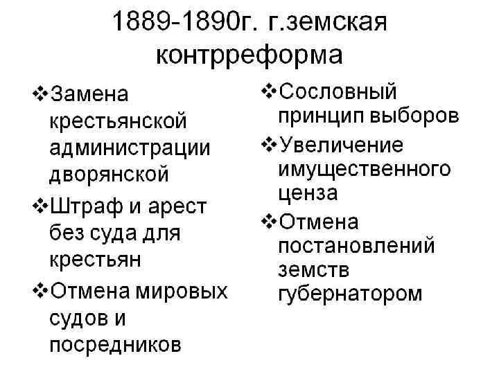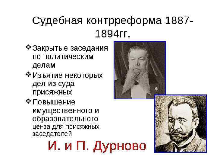 Контрреформы – принятое в исторической литературе название мероприятий правительства Александра III по пересмотру итогов реформ 60 -70 - хх годов.