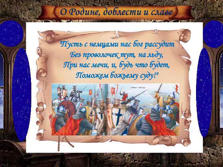 "Пусть с немцами нас бог рассудит Без проволочек тут, на льду, При нас мечи, и, будь что будет, Поможем божьему суду!"