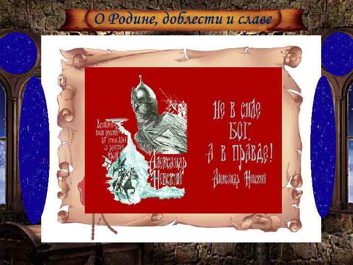 О Родине, доблести и славе Когда исполнилось Александру 18 лет, отец поручит ему княжить в Новгороде. Он вырос, превратился в ловкого, сильного отрока, который любил читать и прекрасно писал. В те времена чтению учились по Священному Писанию. Александр полюбил слово Божие и хорошо его усвоил. Заповеди Христовы глубоко проникли в сердце мальчика.
