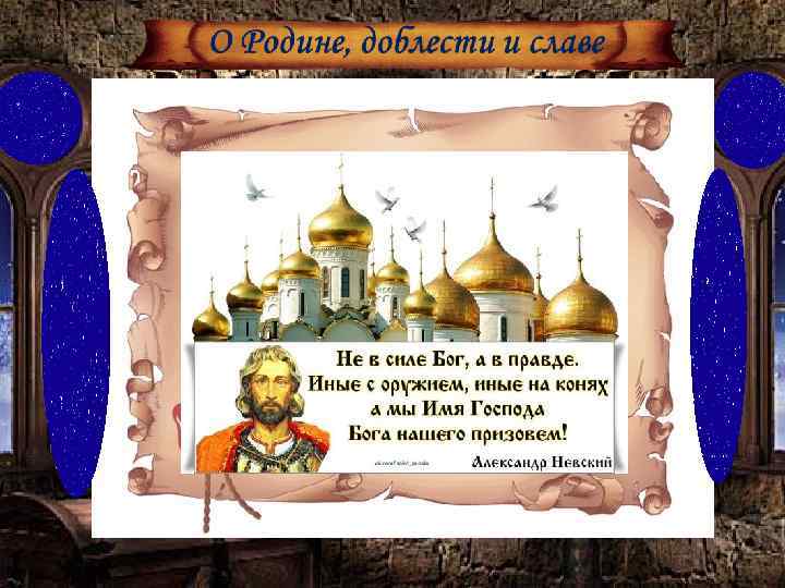 О Родине, доблести и славе Судьба Русской Православной Церкви неразрывно связана с именем святого благоверного князя Александра Невского. Он молодым был и пригожим, Всем сердцем Русь свою любил, Молва носилась: "Богом рожден", Великим, мудрым князем был!
