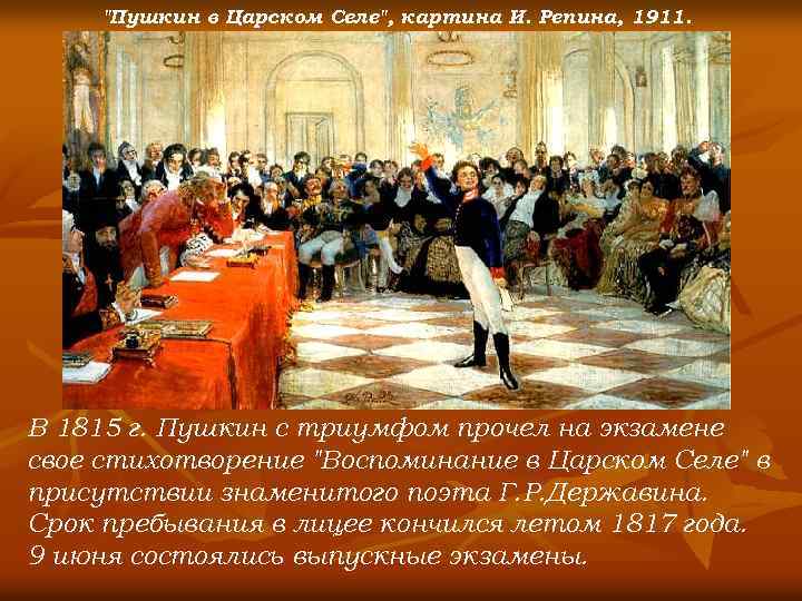 "Пушкин в Царском Селе", картина И. Репина, 1911. В 1815 г. Пушкин с триумфом прочел на экзамене свое стихотворение "Воспоминание в Царском Селе" в присутствии знаменитого поэта Г. Р. Державина. Срок пребывания в лицее кончился летом 1817 года. 9 июня состоялись выпускные экзамены.