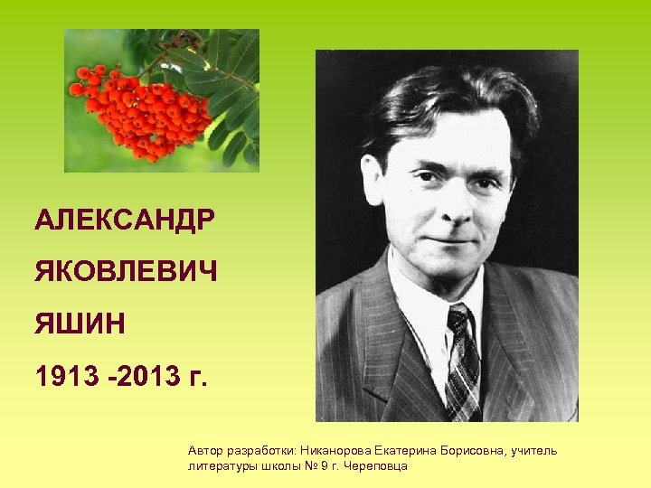 АЛЕКСАНДР ЯКОВЛЕВИЧ ЯШИН 1913 -2013 г. Автор разработки: Никанорова Екатерина Борисовна, учитель литературы школы № 9 г. Череповца