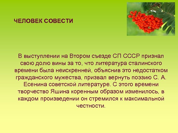 ЧЕЛОВЕК СОВЕСТИ В выступлении на Втором съезде СП СССР признал свою долю вины за то, что литература сталинского времени была неискренней, объяснив это недостатком гражданского мужества, призвал вернуть поэзию С. А. Есенина советской литературе. С этого времени творчество Яшина коренным образом изменилось, в каждом произведении он стремился к максимальной честности.