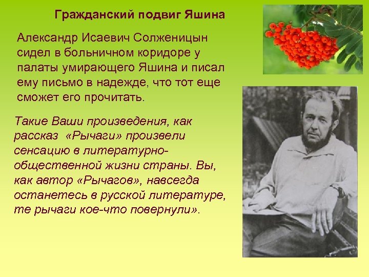 Гражданский подвиг Яшина Александр Исаевич Солженицын сидел в больничном коридоре у палаты умирающего Яшина и писал ему письмо в надежде, что тот еще сможет его прочитать. Такие Ваши произведения, как рассказ «Рычаги» произвели сенсацию в литературнообщественной жизни страны. Вы, как автор «Рычагов» , навсегда останетесь в русской литературе, те рычаги кое-что повернули» .